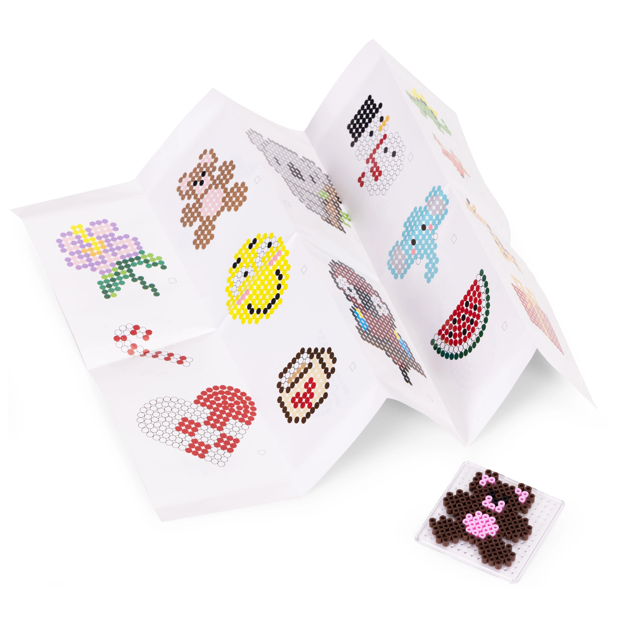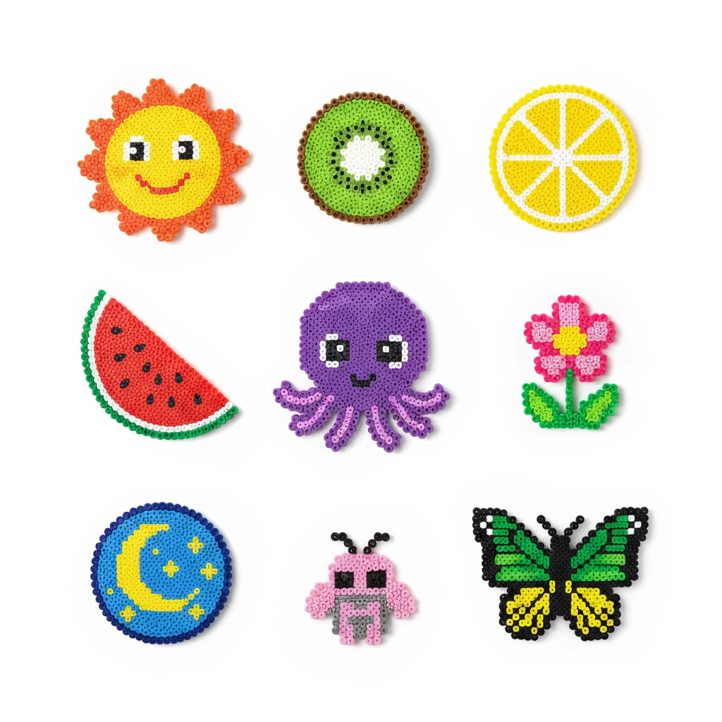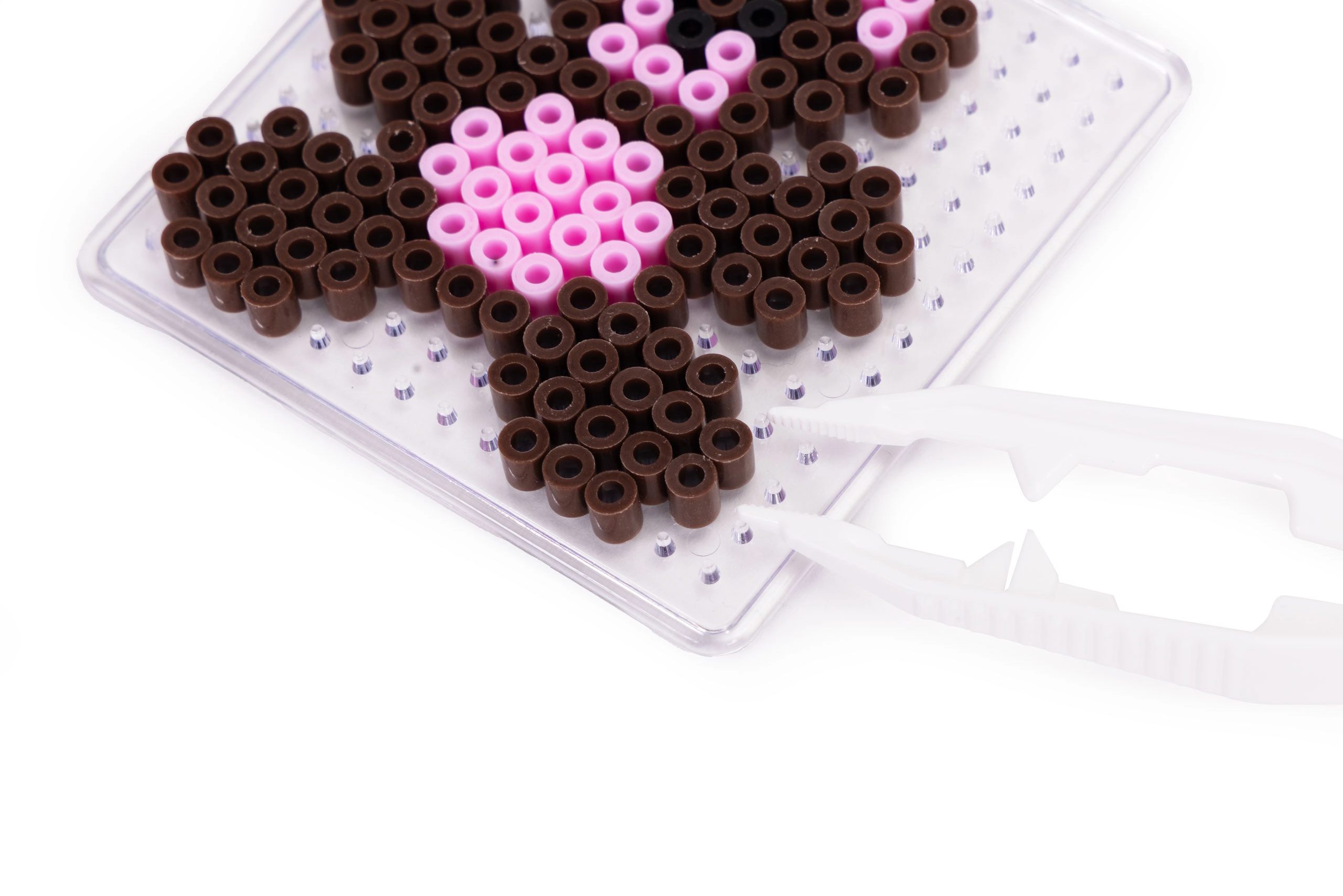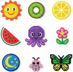 Duży zapas koralików w szerokiej palecie barw pozwala dzieciom układać zwierzątka, symbole, ozdoby oraz obrazy w stylu „pixel art” – od prostych motywów po dopracowane wzory.