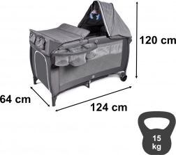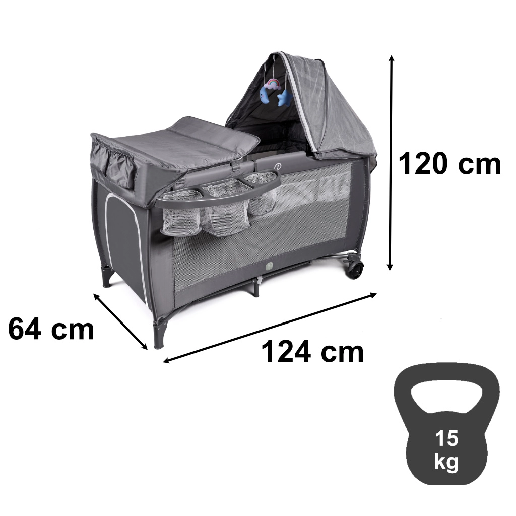 To wielofunkcyjne łóżeczko turystyczne rośnie z Twoim dzieckiem od urodzenia do ok. 36 miesięcy. Solidna rama w kształcie X oraz dwa poziomy wysokości spania zapewniają bezpieczeństwo i komfort, a panele z siatki gwarantują świetną cyrkulację powietrza i podgląd maluszka. Daszek z moskitierą chroni przed owadami, a zawieszone pluszowe zabawki bawią dziecko.