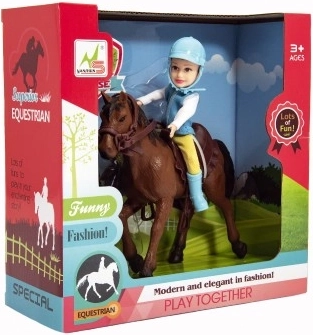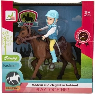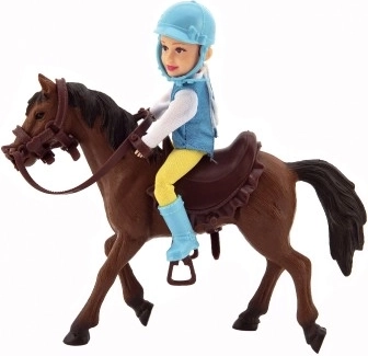 Wszystkich małych miłośników koni ucieszy dżokej z konikiem z uzdą i siodłem. Dżokej musi mieć strój jeździecki i kask. Grzywa ani ogon konia nie nadają się do czesania. Wykonano z wysokiej jakości i wytrzymałych materiałów. Wymiary opakowania: 23 × 23 × 9,5 cm. Odpowiednie dla dzieci od 3 lat.