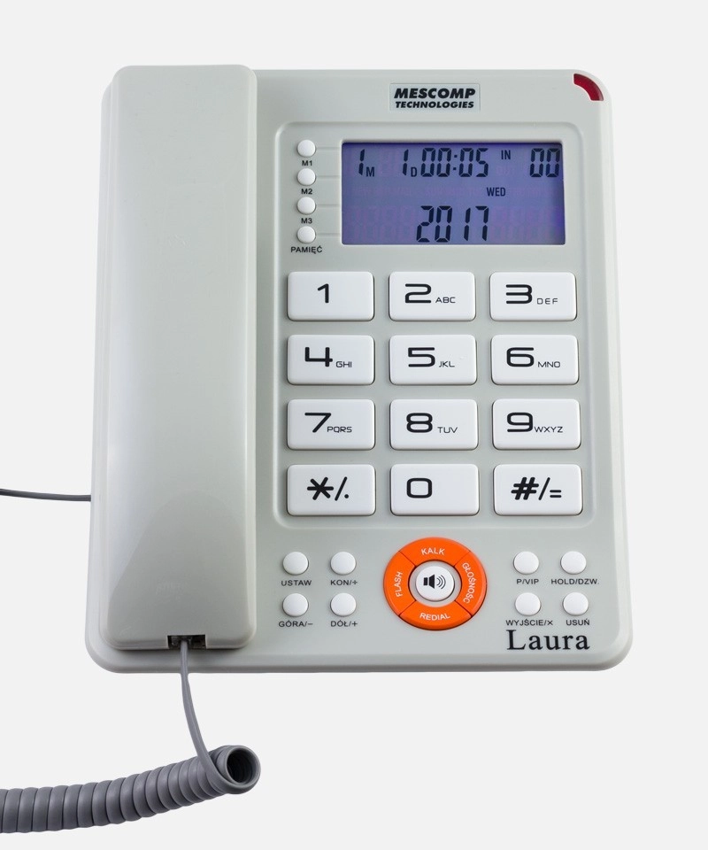 Mescomp Laura MT-816 łączy nowoczesny wygląd z maksymalną czytelnością i prostą obsługą. Dzięki podświetlanemu wyświetlaczowi z regulacją kontrastu oraz dużym klawiszom doskonale nadaje się dla seniorów i użytkowników ze słabszym wzrokiem. W biurze docenisz historię połączeń, redial oraz funkcję VIP do ochrony ważnych kontaktów.