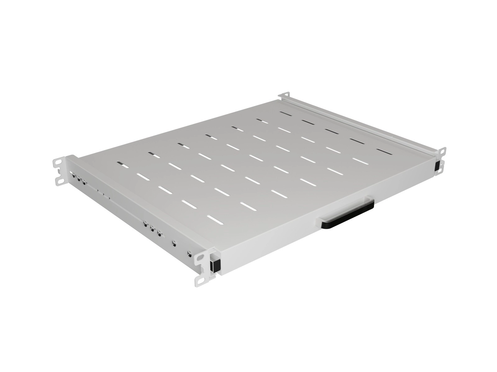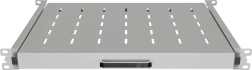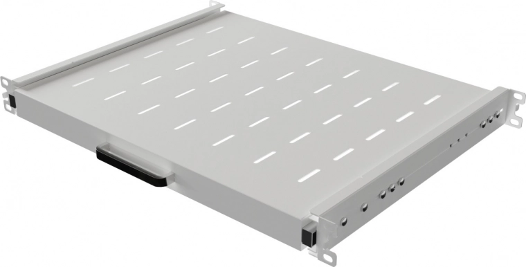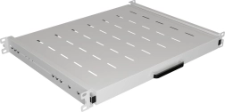 Teleskopowe prowadnice i przedni uchwyt umożliwiają gładkie wysunięcie półki dla łatwej obsługi i serwisu urządzeń w szafie rack.
