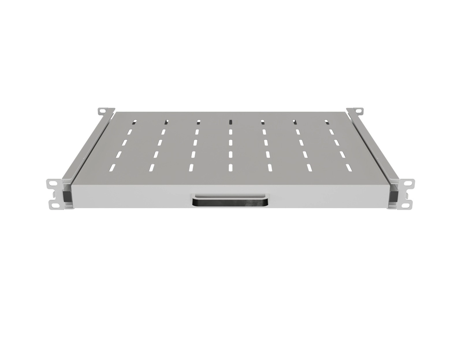 Perforowana powierzchnia wspiera optymalny przepływ powietrza i odprowadzanie ciepła, a praktyczny przedni uchwyt ułatwia manipulację. Czteropunktowy montaż gwarantuje stabilność i niezawodność całego zestawu. Regulowane uchwyty montażowe pozwalają na instalację w szafach o różnej głębokości, dzięki czemu rozwiązanie jest uniwersalne i łatwe do dopasowania.