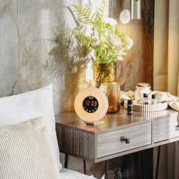 Budzik stopniowo rozjaśnia światło, aby obudzić Cię delikatnie i bez stresu. Wspiera prawidłowy rytm snu i przyjemniejsze poranki.