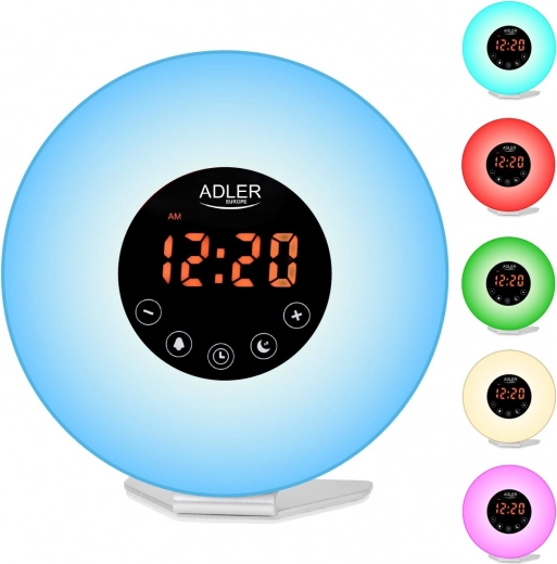 Wieczorem docenisz tryb zasypiania ze stopniowym ściemnianiem i timerem na 15/30/60 minut. Sześć trybów kolorów (niebieski, pomarańczowy, indygo, fioletowy, czerwony, zielony) tworzy przyjemną atmosferę i sprawdzi się także jako lampka. Wyświetlacz ma 4 poziomy jasności (wysoki/średni/niski/wyłączony), więc w nocy nie przeszkadza.