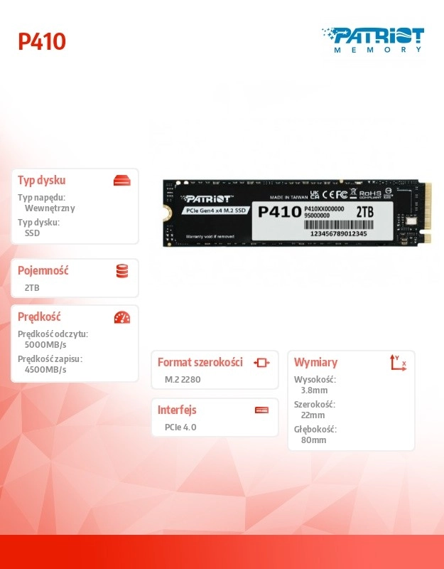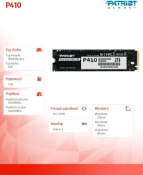 Ulepsz responsywność systemu i skróć czasy ładowania dzięki SSD PATRIOT P410. Interfejs PCIe Gen4 x4 oraz protokół NVMe 1.4 zapewniają najwyższą szybkość transferu danych, a energooszczędna konstrukcja pomaga wydłużyć czas pracy na baterii w laptopach. Kompaktowy format M.2 2280 gwarantuje bezproblemową kompatybilność ze współczesnymi komputerami stacjonarnymi i laptopami.