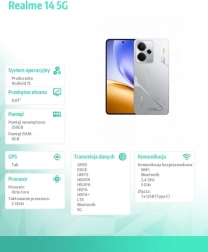 Stylowy smartfon Realme 14 5G w kolorze Mecha Silver oferuje topowy 6,67" wyświetlacz AMOLED z 120 Hz i jasnością do 2000 nitów, wydajny układ Snapdragon 6 Gen 4, dużą baterię 6000 mAh oraz zestaw aparatów z 50 Mp głównym aparatem z OIS. Nie zabrakło 5G, Wi‑Fi 6, Bluetooth 5.2, Dual SIM ani Androida 15 z Realme UI 6.0.