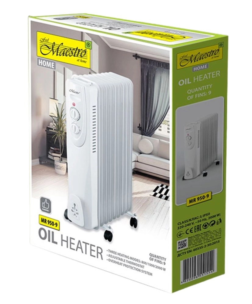 Olejowy grzejnik Maestro MR-950-9 to niezawodne rozwiązanie na chłodne dni. Oferuje wysoką moc do 2000 W, płynną regulację temperatury oraz równomierną dystrybucję ciepła dzięki 9 żebrom. Praktyczne kontrolki informują o pracy urządzenia, a solidna konstrukcja zapewnia długą żywotność.