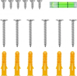 W komplecie znajduje się zestaw montażowy ze śrubami, kołkami i mini poziomicą do precyzyjnego i szybkiego mocowania na ścianie.