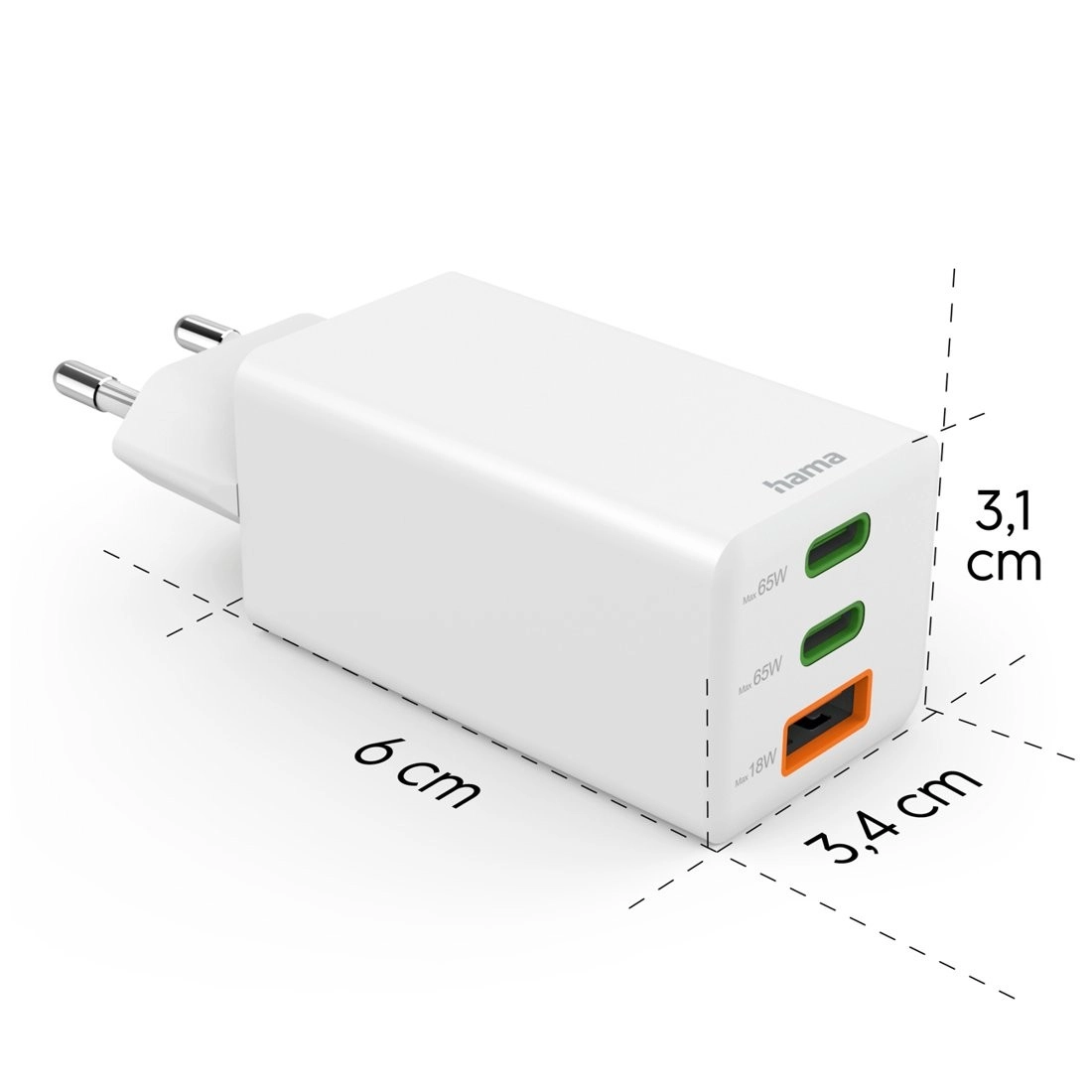 Kompaktowa ładowarka sieciowa Hama z technologią GaN i mocą 65 W szybko naładuje telefon, tablet i laptop. Wspiera Power Delivery i Quick Charge, ma 2× USB‑C + 1× USB‑A do jednoczesnego ładowania trzech urządzeń. Oferuje bezpieczne ładowanie, inteligentne zarządzanie prądem oraz do 60% w 30 minut w kompatybilnych telefonach.