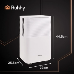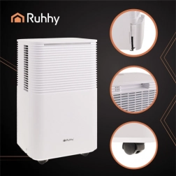 RUHHY DRYZIX to kondensacyjny osuszacz zaprojektowany do efektywnego pochłaniania wilgoci z wydajnością 12 l/24 h. Zintegrowane higrometr i higrostat utrzymują ustawiony poziom wilgotności, a automatyczne odszranianie chroni elementy chłodzące przed oblodzeniem i zapewnia stabilną pracę nawet w niższych temperaturach.