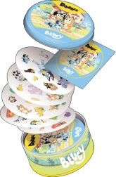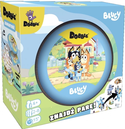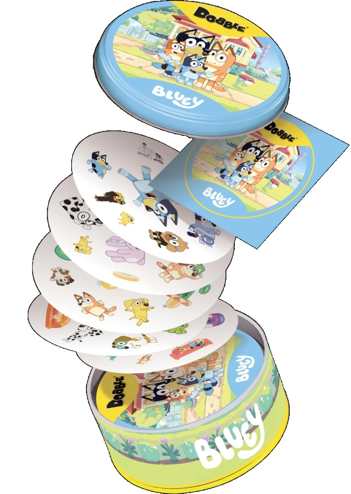 Dobble BLUEY to świeża, rodzinna rozrywka z postaciami i przedmiotami ze świata BLUEY. Na każdej parze kart znajduje się dokładnie jeden wspólny symbol – kto go pierwszy znajdzie i nazwie, zyskuje przewagę. Różne rozmiary i obroty symboli zwiększają wyzwanie i frajdę z każdej rozgrywki.