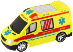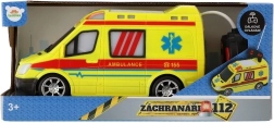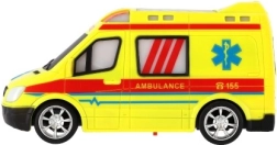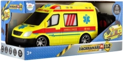 Wyrazista żółta karetka z oznaczeniami AMBULANCE i działającym światłem wspiera kreatywną zabawę małych ratowników.