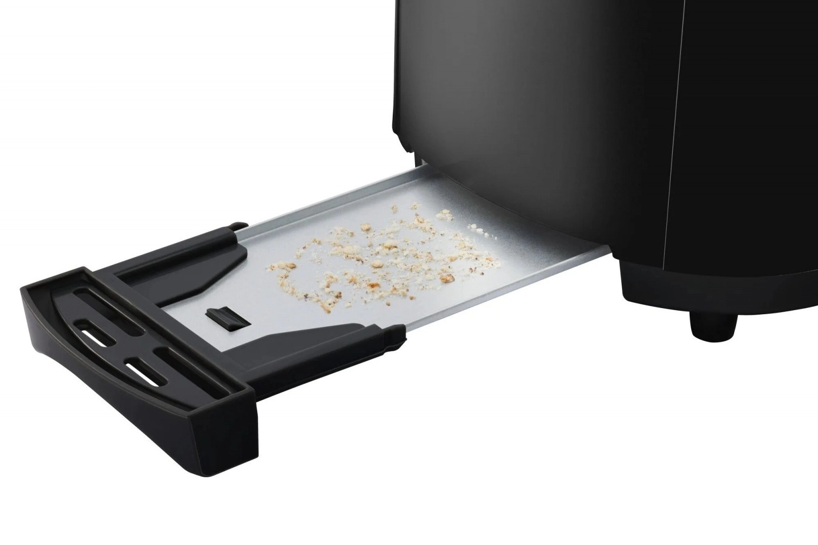Praktyczna funkcja rozmrażania wydłuża cykl tak, aby mrożone pieczywo najpierw delikatnie się rozmroziło, a następnie równomiernie opiekło. Przycisk Stop natychmiast przerywa proces bez wyciągania wtyczki z gniazdka, a automatyczne wyłączanie zapewnia bezpieczną pracę po zakończeniu opiekania.