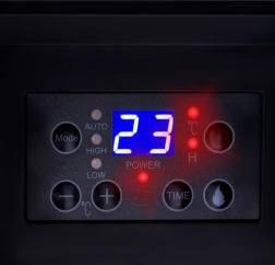 Grzejnik oferuje 3 tryby (wysoki/niski/auto), regulację temperatury 26–38 °C, wyświetlacz LCD oraz timer w krokach co 1 h (1–8 h). Praktyczne zdalne sterowanie i czytelny panel ułatwiają obsługę z kanapy. O Twoje bezpieczeństwo dba bezpiecznik termiczny, zabezpieczenie przed przegrzaniem, wyłącznik przechyłowy i osłona ochronna. Stabilne nóżki i zintegrowany uchwyt ułatwiają przenoszenie.