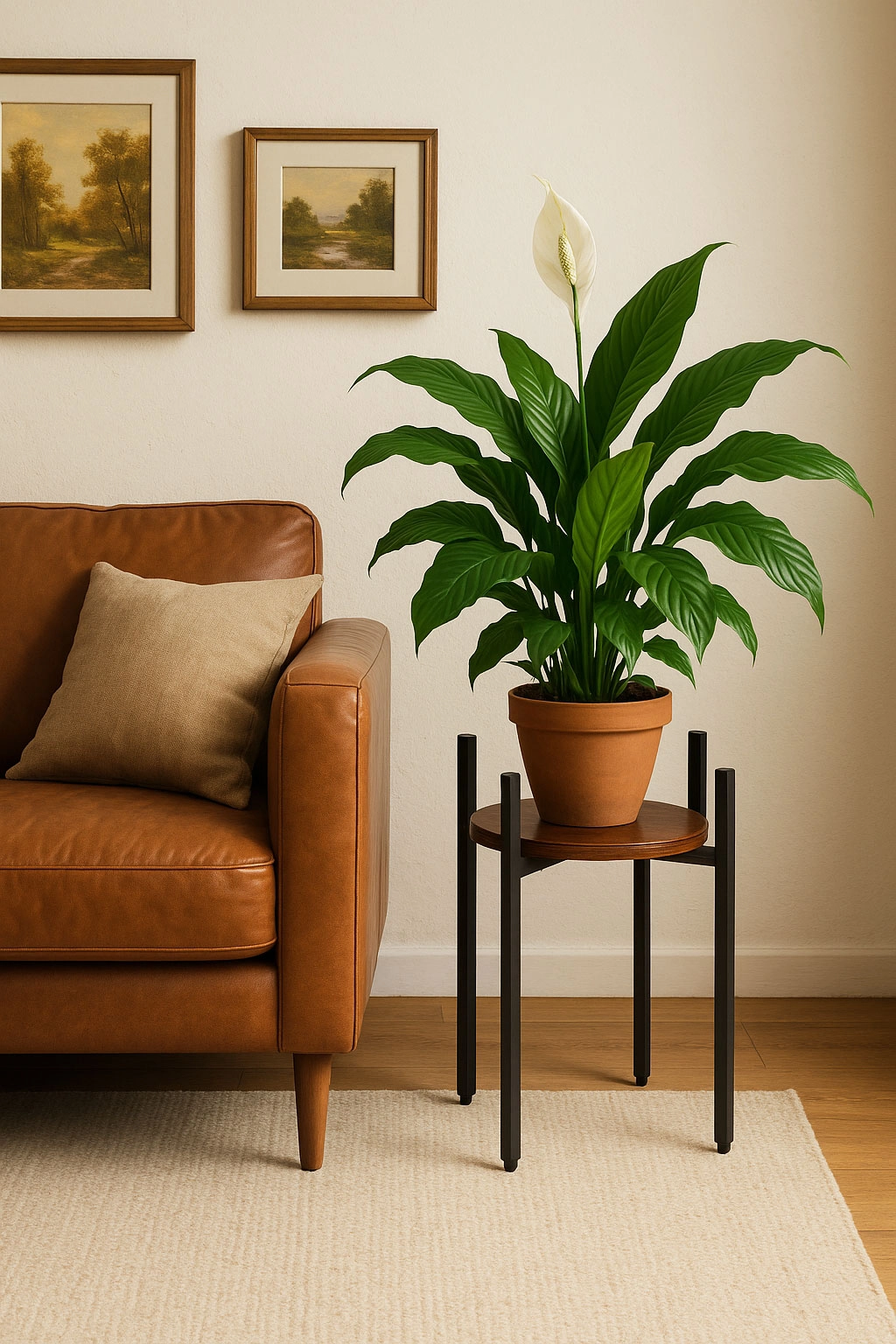 Połączenie czarnej stali i drewnianej półki tworzy czysty, ponadczasowy wygląd, który podkreśli piękno Twoich roślin w salonie, biurze i na tarasie.