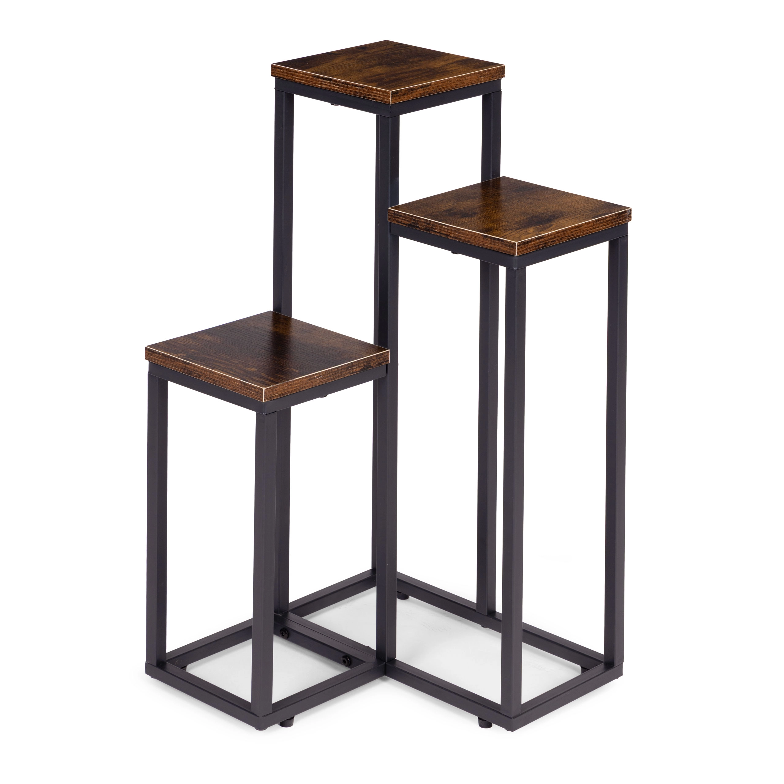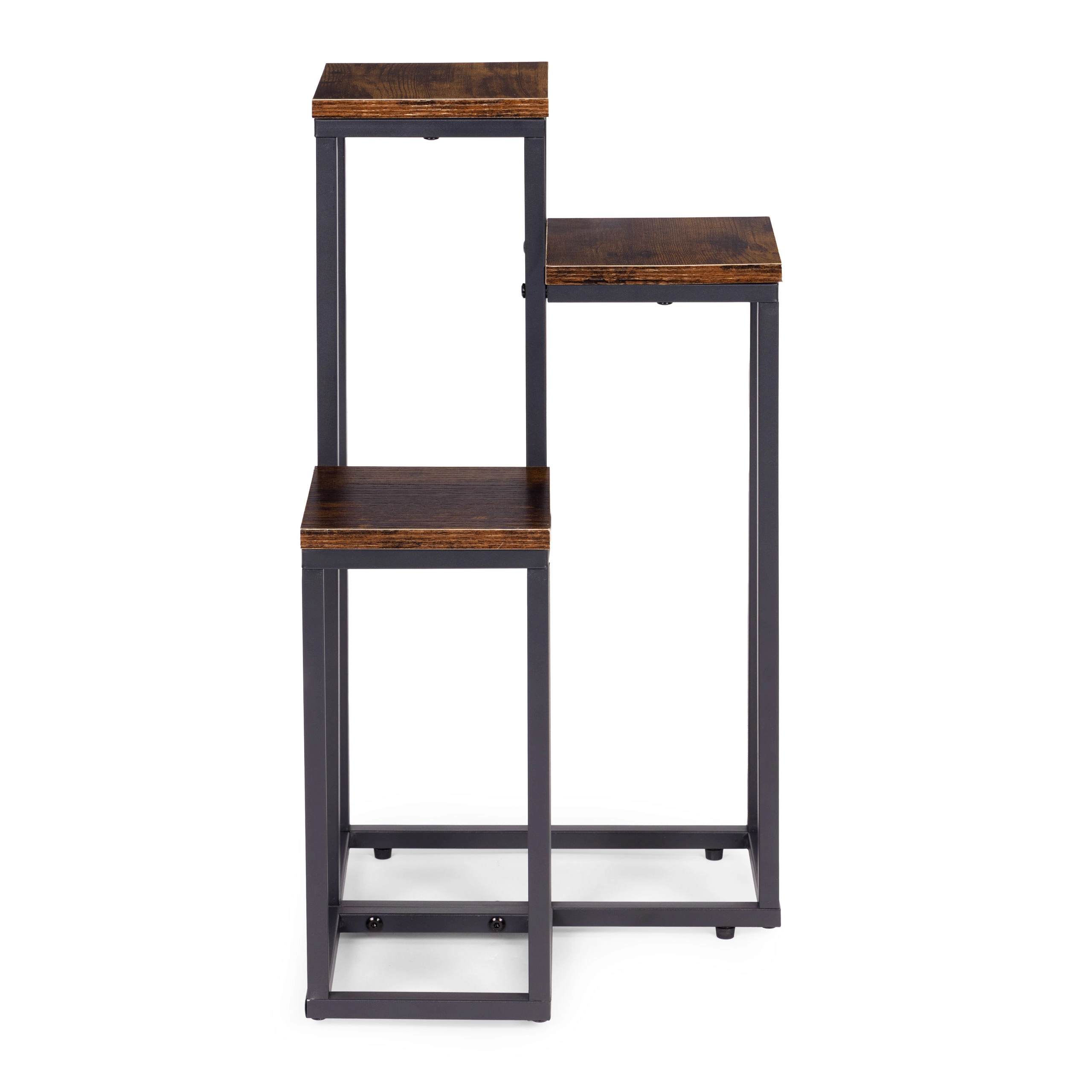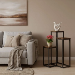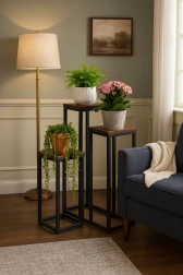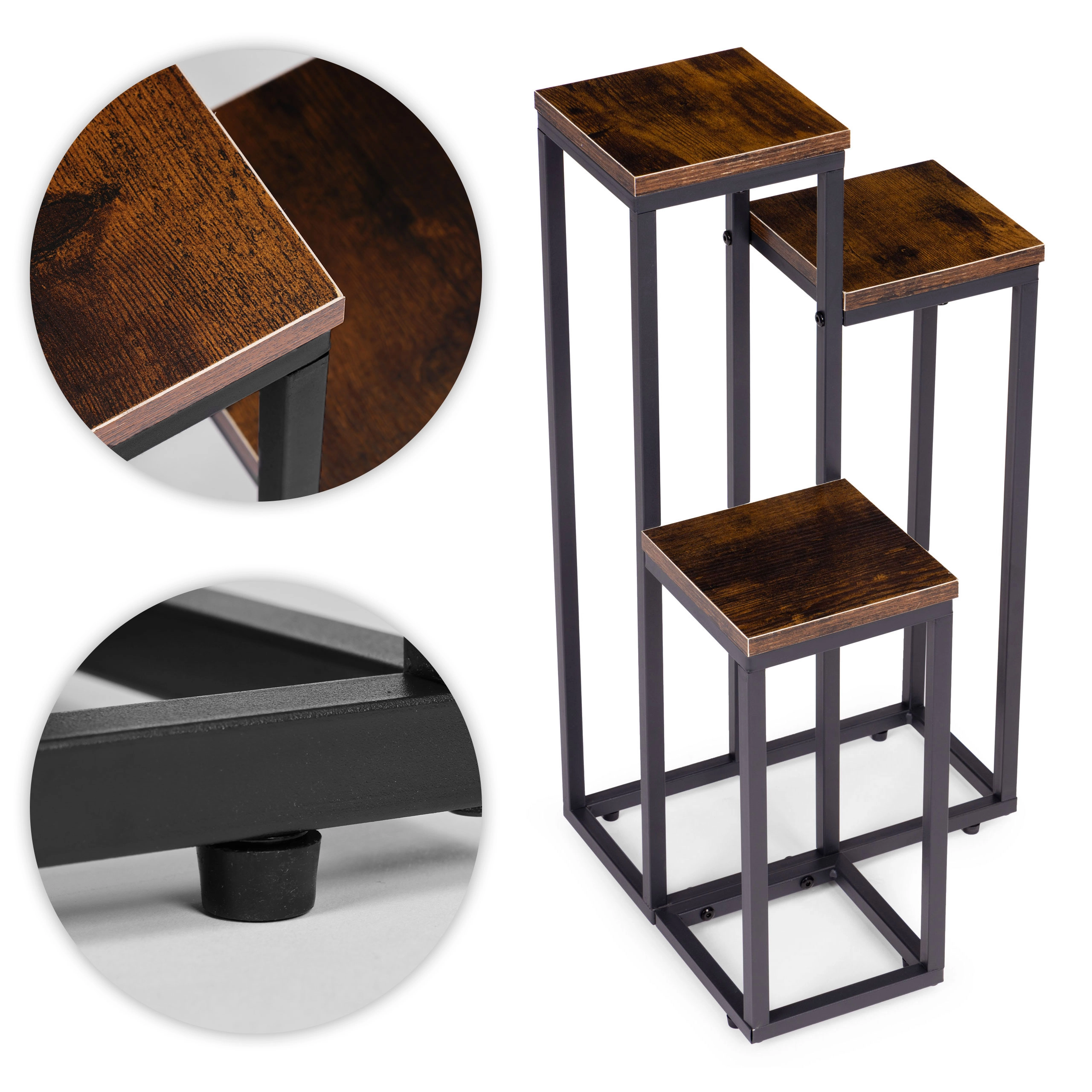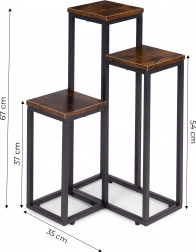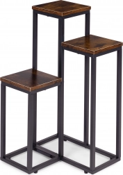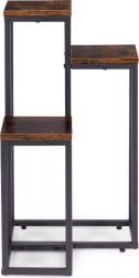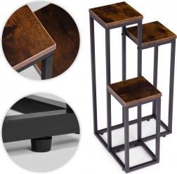 Rama z malowanej proszkowo stali jest odporna na korozję i zużycie mechaniczne, a blaty w dekorze naturalnego drewna podkreślają nowoczesny loftowy charakter. Antypoślizgowe stopki zwiększają stabilność i chronią podłogę przed zarysowaniami. Maksymalny udźwig 5 kg jest idealny dla większości doniczek i dekoracji.