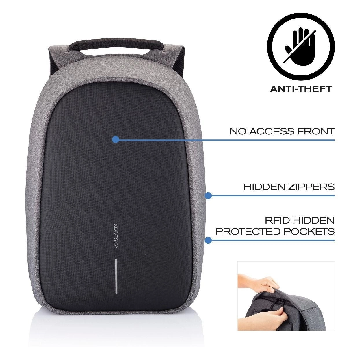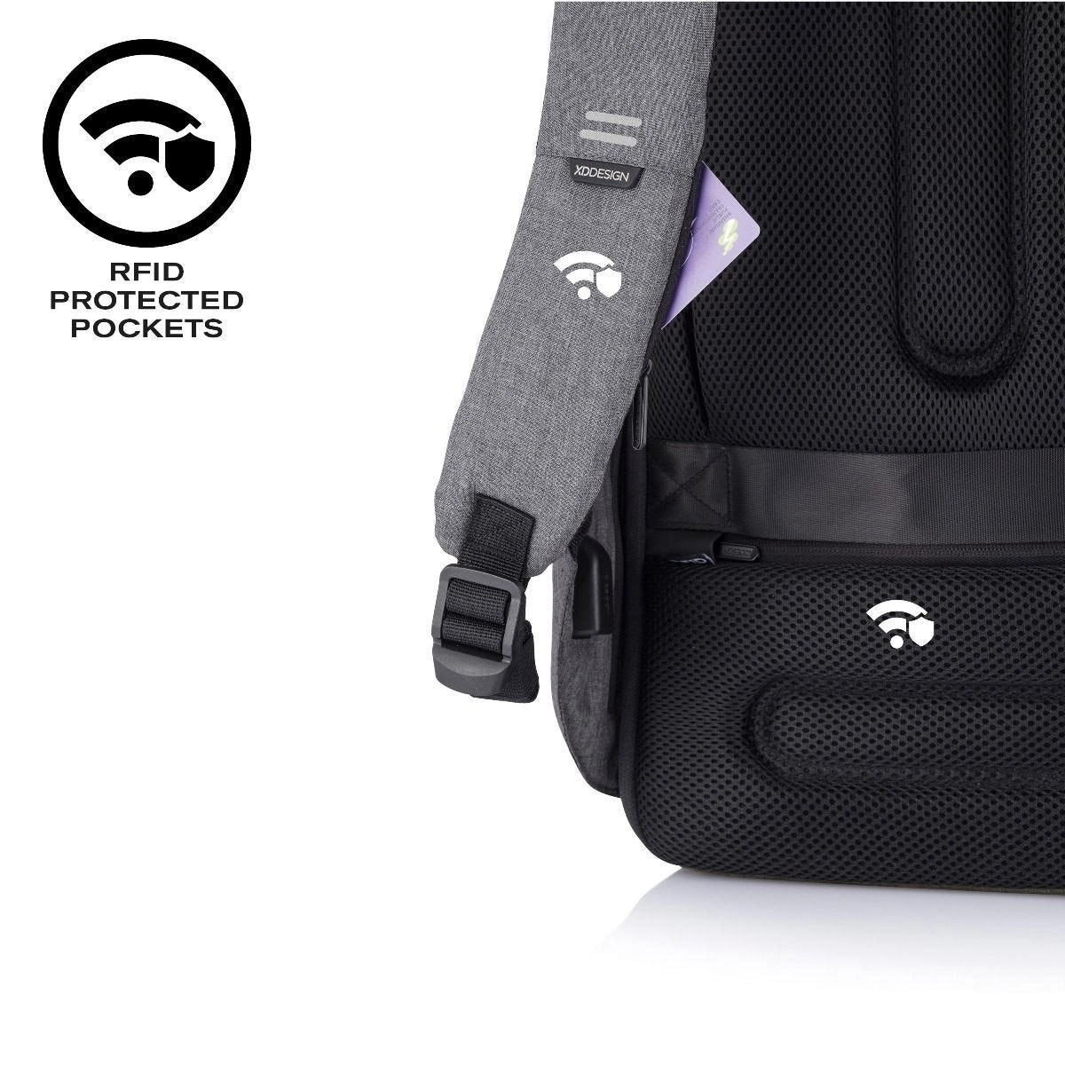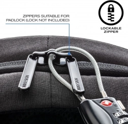 - Antykradzieżowy design: dostęp wyłącznie od strony pleców, ukryte zamki, ukryte kieszenie (RFID)