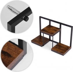 Wytrzymała konstrukcja z malowanej proszkowo stali oraz półki z płyty wiórowej laminowanej w dekorze naturalnego drewna gwarantują stabilność i długą żywotność. Wstępnie nawiercone otwory i dołączone kołki ze śrubami umożliwiają szybki i bezpieczny montaż także dla cięższych donic.