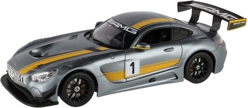 Odkryj precyzyjnie wykonany model RC MERCEDES-AMG GT3 w szarym kolorze z żółtymi pasami i wyrazistym tylnym skrzydłem. Detaliczna karoseria wyróżnia się sportowymi liniami i autentycznymi elementami auta wyścigowego, które ucieszą każdego fana szybkich samochodów.