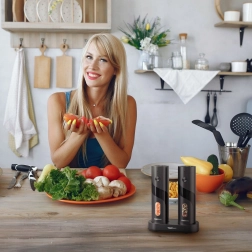 Odkryj wygodę automatycznego doprawiania jedną ręką. Ten duet elektrycznych młynków łączy nowoczesny design, precyzyjne mielenie i łatwą konserwację. Przezroczyste okienka pokazują pozostałą zawartość, a światło LED doświetla talerz lub patelnię dla dokładnego dozowania przypraw.