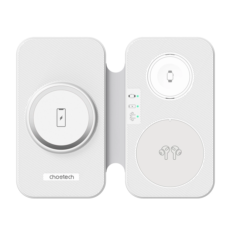 Ładuj trzy urządzenia jednocześnie – telefon, zegarek i słuchawki – oszczędzając czas i miejsce na biurku. Składana konstrukcja pełni rolę praktycznej podstawki, dzięki czemu możesz wygodnie oglądać wideo lub prowadzić wideorozmowy podczas ładowania. Wydajna cewka zapewnia stabilne i szybkie ładowanie bezprzewodowe o wysokiej efektywności.