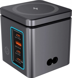 Wydajna ładowarka sieciowa BlitzWolf z technologią GaN oferuje do 105 W do jednoczesnego zasilania nawet 6 urządzeń. Wyposażona w 3× USB‑C, USB‑A oraz dwie strefy bezprzewodowe (telefon 15 W, słuchawki 5 W). Wspiera szybkie ładowanie PD/QC, idealna do laptopów, telefonów, tabletów oraz Apple Watch, a także posiada wskaźnik LED stanu.<