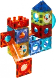 Magnetyczne klocki i elementy toru z wytrzymałego plastiku ABS łatwo i stabilnie łączą się dzięki silnym magnesom. Dzieci mogą budować płaskie i przestrzenne konstrukcje, wieże, mosty, a przede wszystkim kreatywne tory kulkowe z tunelami, zakrętami i miskami. Przezroczyste kolory wspierają postrzeganie kształtów i barw oraz zachęcają do odkrywania.