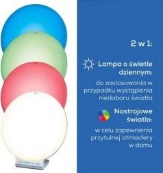 Dzięki funkcji Moodlight stworzysz przyjemną atmosferę dzięki kolorowemu podświetleniu. W aplikacji mobilnej możesz wybierać spośród 10 predefiniowanych scen, dostosować jasność i timer lub ręcznie wybrać i zapisać kolor z 256 odcieni. Praktyczny timer LED oferuje pięć czasów terapii i po upływie ustawionego czasu automatycznie wyłącza lampę.