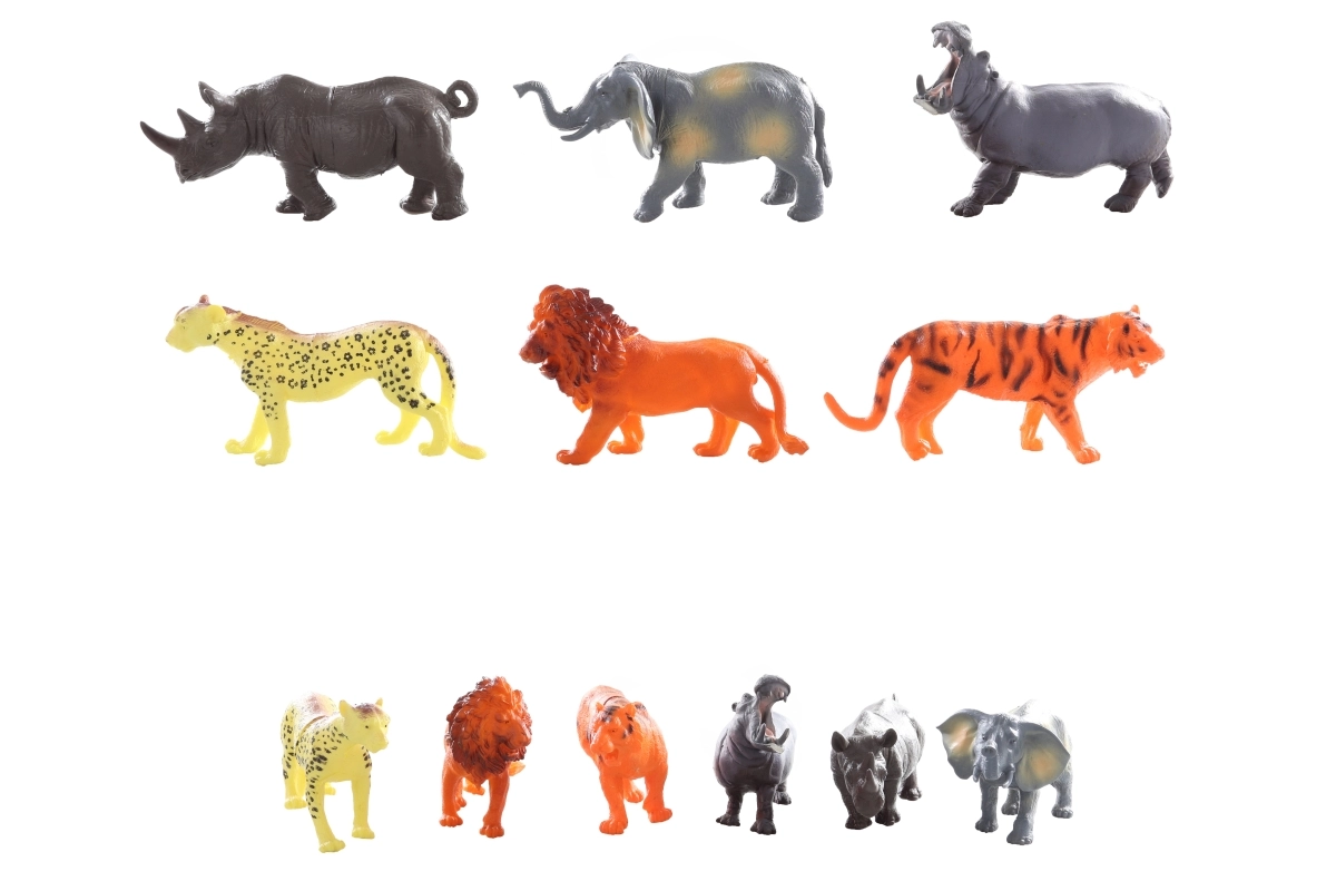 W opakowaniu znajdziesz 12 sztuk – po 2x hipopotam, nosorożec, słoń, tygrys, lew i gepard. Figurki są odpowiednie do kreatywnej zabawy, projektów szkolnych i tematycznych dekoracji.