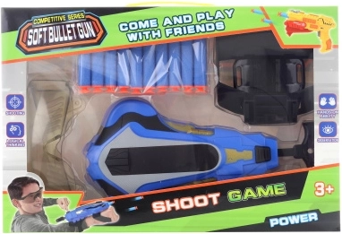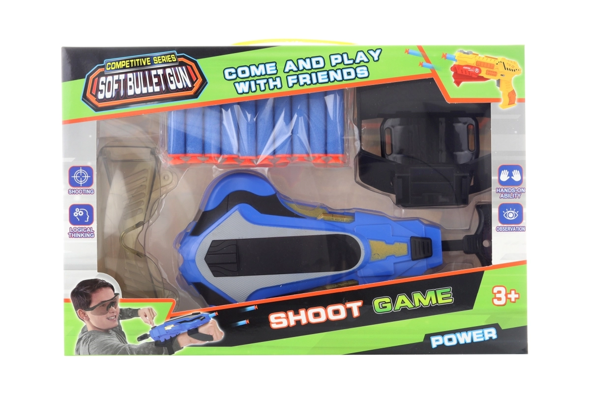 - Pistolet, uchwyt na rękę, 10 piankowych naboi, okulary ochronne