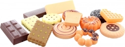 Zestaw obejmuje wybór słodkości – wafle, ciasteczka, czekoladę i gofry – idealny do zabawy w sklep lub kuchnię. Praktyczne opakowanie w pudełku prezentowym tworzy z niego świetny prezent dla małych kucharzy.