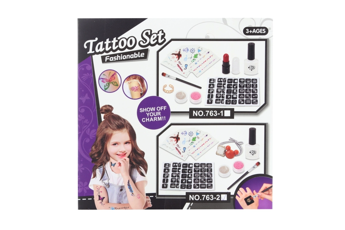 - 5 małych arkuszy tatuaży, 4 arkusze szablonów, buteleczka z preparatem do nakładania brokatu, 2 pojemniczki z brokatem, pędzelek, bransoletka