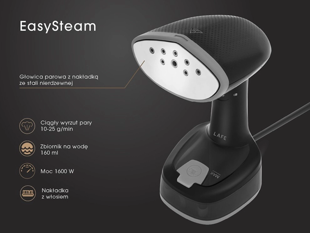 Lafe EasySteam to praktyczna alternatywa dla żelazka do szybkiego i delikatnego wygładzania ubrań. Dzięki mocy 1600 W i stabilnemu wyrzutowi pary 15–25 g/min radzi sobie z codziennymi zagnieceniami, nie uszkadzając delikatnych materiałów. Nierdzewna głowica równomiernie rozprowadza parę dla efektywnych rezultatów.