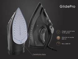 Trwała ceramiczna stopa zapewnia płynny poślizg, równomierną dystrybucję ciepła i ochronę tkanin przed uszkodzeniami. Zbiornik na wodę o pojemności 600 ml pozwala prasować dłużej bez częstego dolewania. Dla czystej i bezpiecznej pracy żelazko wyposażono w Anti-Drip (ochrona przed kapaniem), Anti-Calc oraz Self Clean (łatwe usuwanie kamienia), a także funkcję Auto Stop do automatycznego wyłączenia w przypadku bezczynności.