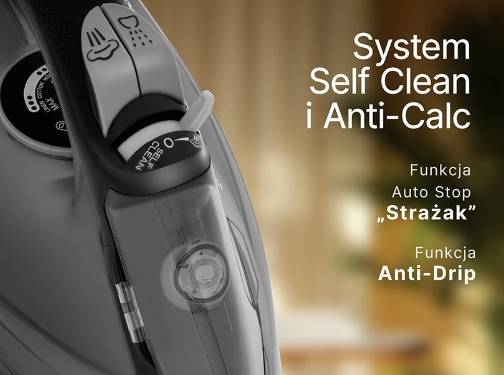 Pojemność 600 ml wydłuża przerwy między dolewaniem wody. Anti-Drip zapobiega kapaniu, Anti-Calc i Self Clean ułatwiają konserwację, a Auto Stop zwiększa bezpieczeństwo.