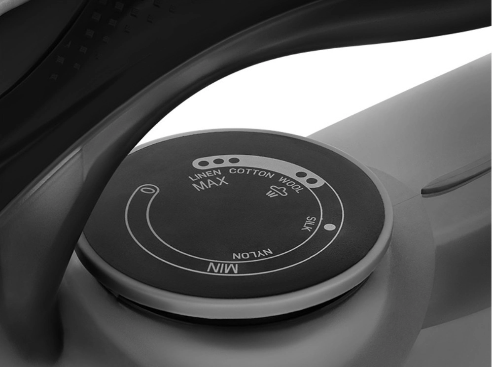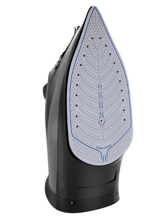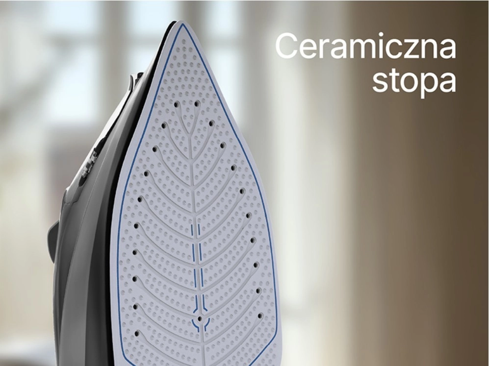 Trwała ceramiczna podeszwa z równomiernym rozprowadzaniem ciepła i licznymi otworami parowymi zapewnia delikatne i skuteczne wygładzanie zagnieceń bez przywierania.