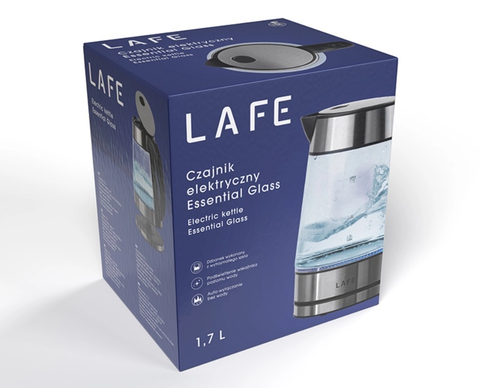 Stylowy szklany czajnik elektryczny Lafe Essential Glass o pojemności 1,7 l szybko doprowadza wodę do wrzenia dzięki wysokiej mocy. Oferuje przezroczyste korpus do kontroli poziomu wody, niebieskie podświetlenie LED, filtr przeciw osadom z kamienia oraz obrotową podstawę 360° dla wygodnego użytkowania w każdej nowoczesnej kuchni.