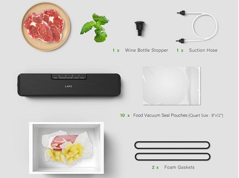 Wybierz 4 tryby w zależności od rodzaju żywności: uniwersalny Normal, delikatny Gentle do kruchych produktów, w pełni automatyczny Vacuum & Seal do szybkiego bezobsługowego pakowania oraz Seal Only do samodzielnego zgrzewania folii. W zestawie znajduje się wężyk do pojemników próżniowych oraz korek/zatyczka do butelek, aby móc odsysać powietrze także z pudełek i zachować świeżość otwartego wina oraz olejów.