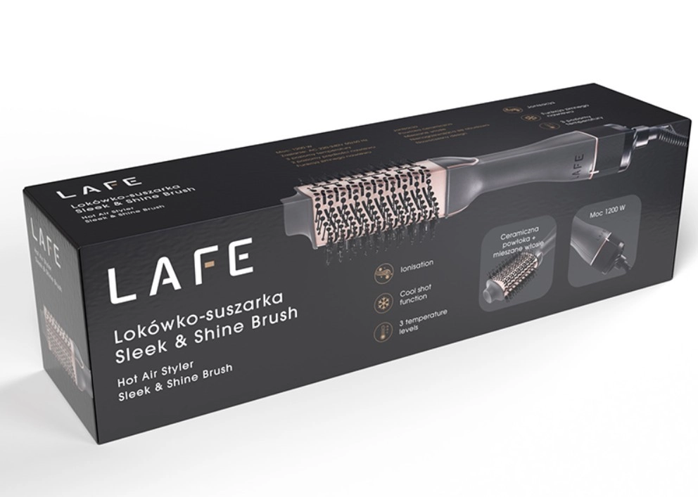 Szczotka elektryczna LAFE Sleek & Shine Brush łączy funkcje suszarki i lokówki, umożliwiając szybką stylizację fryzury jednym pociągnięciem. Jonizacja zmniejsza elektryzowanie i ujarzmia odstające kosmyki, dzięki czemu włosy pozostają gładkie, lśniące i podatne.