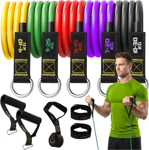 Kompletny zestaw gum oporowych TRIZAND do efektywnego treningu w domu i na siłowni. Zawiera 5 taśm o oporze 4–30 kg, uchwyty na dłonie, paski na kostki, blokadę do drzwi oraz etui. Dzięki wytrzymałemu lateksowi, wysokiej elastyczności i antypoślizgowym rączkom bezpiecznie przećwiczysz całe ciało – plecy, ręce, nogi, brzuch i pośladki.