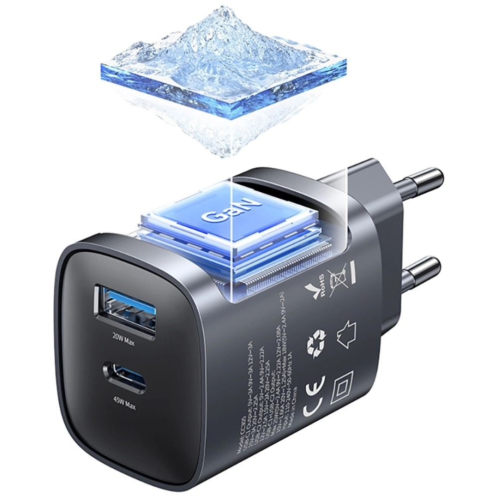 Ładowarka wspiera standardy USB Power Delivery (PD) i Quick Charge (QC). Przy użyciu jednego portu wykorzystasz pełną moc do 45 W; przy ładowaniu dwóch urządzeń moc jest inteligentnie dzielona dla stabilnego i bezpiecznego ładowania.