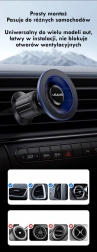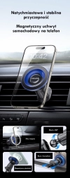 USAMS ZJ081 łączy wytrzymałe materiały (akryl i silikon) z przemyślaną ergonomią. Mocne magnesy z systemem automatycznego centrowania zapewniają stabilne mocowanie telefonu, a kulowy przegub umożliwia płynną regulację w trybie pionowym i poziomym. Kompaktowe wymiary nie przeszkadzają w kabinie i nie obciążają kratki nawiewu.