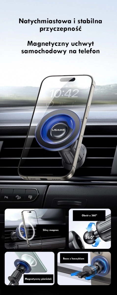 Elegancki i praktyczny magnetyczny uchwyt samochodowy USAMS ZJ081 do mocowania w kratce nawiewu oferuje silne magnetyczne trzymanie, automatyczne centrowanie oraz przegub obrotowy 360° dla idealnego kąta widzenia. Dzięki kompaktowej konstrukcji i szybkiemu montażowi bez narzędzi bezpiecznie utrzyma smartfon także w etui, nawet na nierównych drogach.