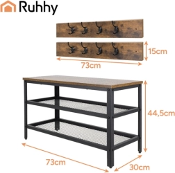 Górny brązowy blat MDF dodaje wnętrzu ciepłego akcentu i wygodnego miejsca do siedzenia przy zakładaniu butów. Dzięki kompaktowym wymiarom 73 × 44 × 30 cm świetnie sprawdzi się także w mniejszych przestrzeniach. Montaż zajmuje około 15 minut – w zestawie znajduje się kompletny pakiet montażowy z wkrętakiem i kluczem imbusowym.