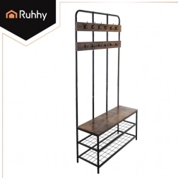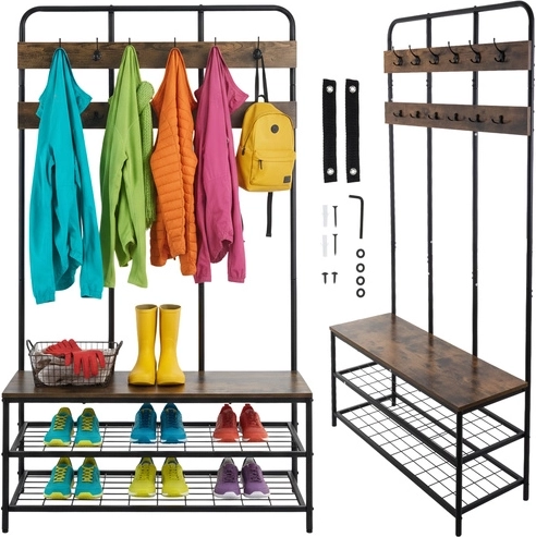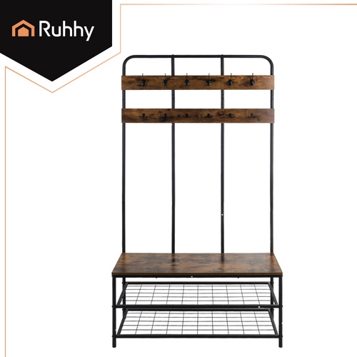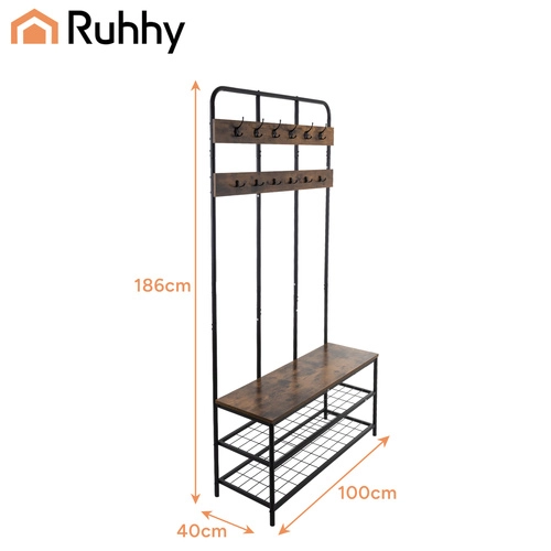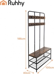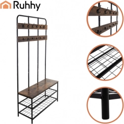 Elegancki i praktyczny regał do przedpokoju RUHHY łączy w sobie stabilną metalową konstrukcję, dwie pojemne półki na buty, wygodne siedzisko oraz 12 podwójnych haczyków dla maksymalnego porządku. Stylowy loftowy design z drewnianym dekorem pasuje zarówno do nowoczesnych, jak i klasycznych wnętrz, a dzięki szybkiemu montażowi wszystko przygotujesz w kilka minut.