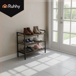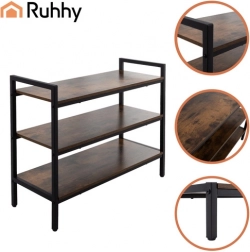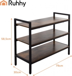 Praktyczna szafka na buty RUHHY w stylu loft łączy funkcjonalność, stabilność i elegancki wygląd. Trzy solidne półki o nośności 30 kg każda pomieszczą obuwie całej rodziny, a wytrzymała metalowa rama i drewniane półki w ciepłym odcieniu dodają wnętrzu nowoczesnego charakteru. Kompaktowe wymiary 79 × 30 × 58,5 cm oszczędzają miejsce, a ochronne stopki zapobiegają rysowaniu podłogi.