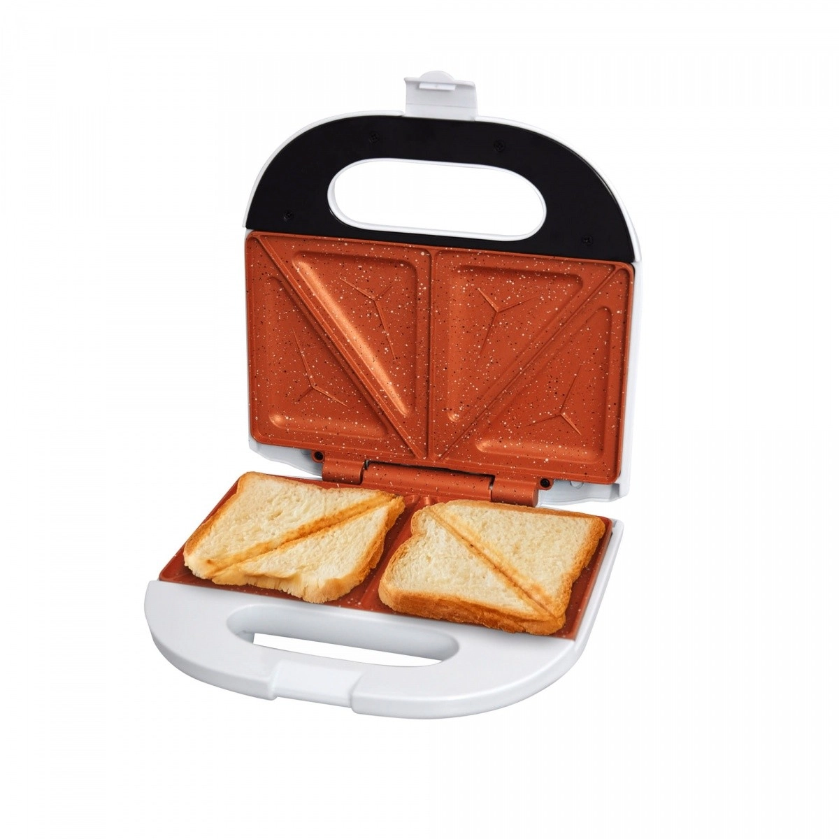 Para trójkątnych płyt równomiernie przypieka pieczywo i nadzienie. Idealny do szybkich śniadań, przekąsek i kolacji.