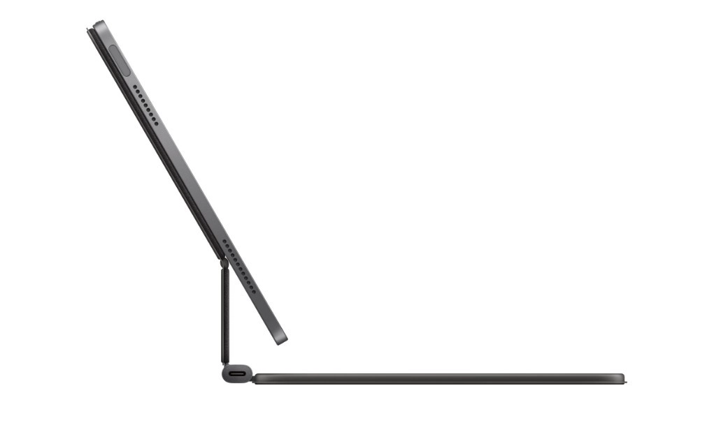 Magnetyczny „pływający” zawias elegancko unosi iPada nad klawiaturą i pozwala wygodnie ustawić idealny kąt do pisania, przeglądania i rozmów wideo.