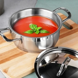 Odkryj wytrzymały garnek Anett z wysokiej jakości stali nierdzewnej 18/10 z matową powierzchnią i eleganckim, błyszczącym pasem. Wielowarstwowe dno akutermiczne szybko akumuluje i równomiernie rozprowadza ciepło, co skraca czas przygotowania i oszczędza energię. Idealny do gotowania zup, sosów oraz duszenia warzyw i mięsa.