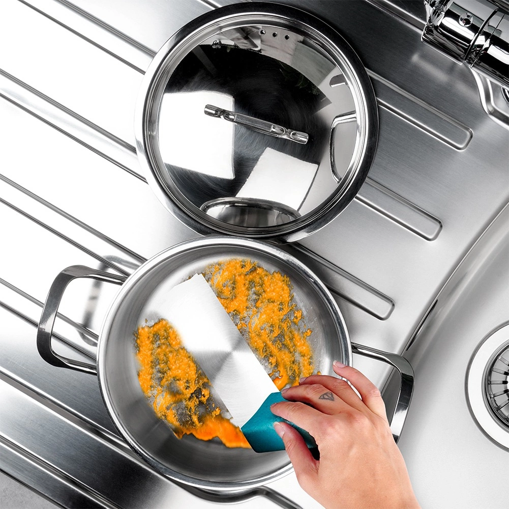 Wytrzymałe, kanapkowe dno doskonale akumuluje i równomiernie rozprowadza ciepło, co skraca czas gotowania i oszczędza energię na wszystkich typach kuchenek, również indukcyjnych.